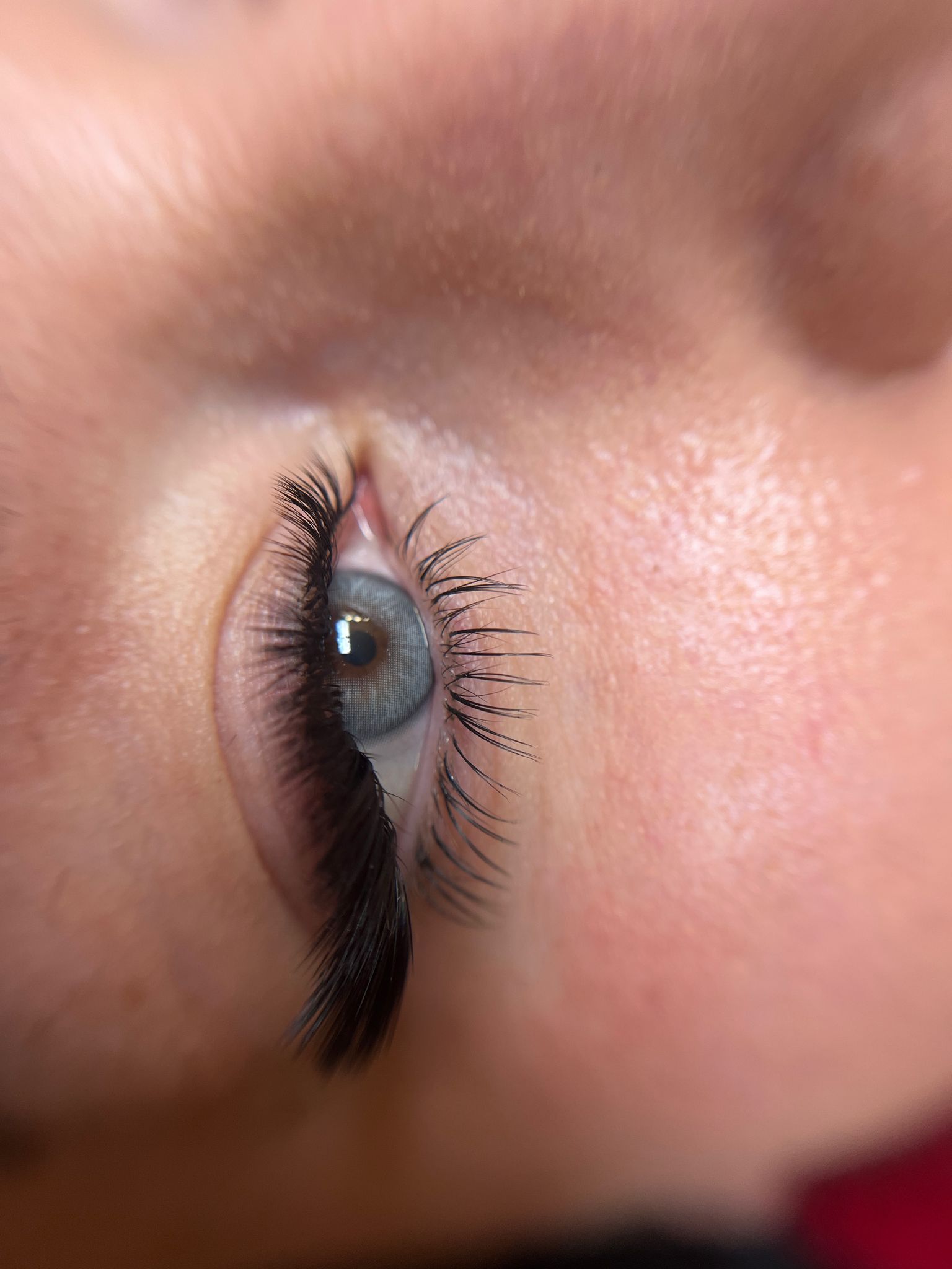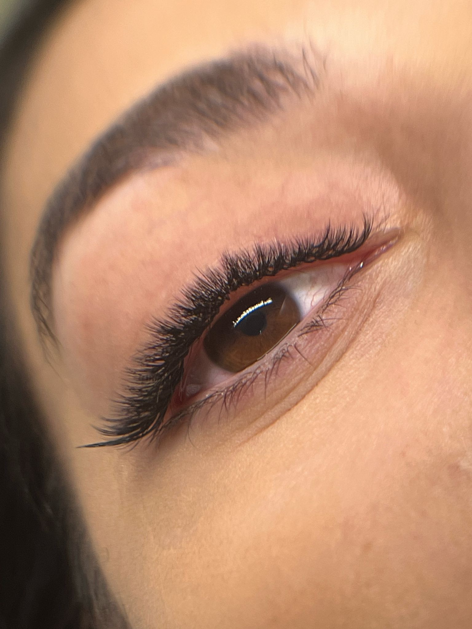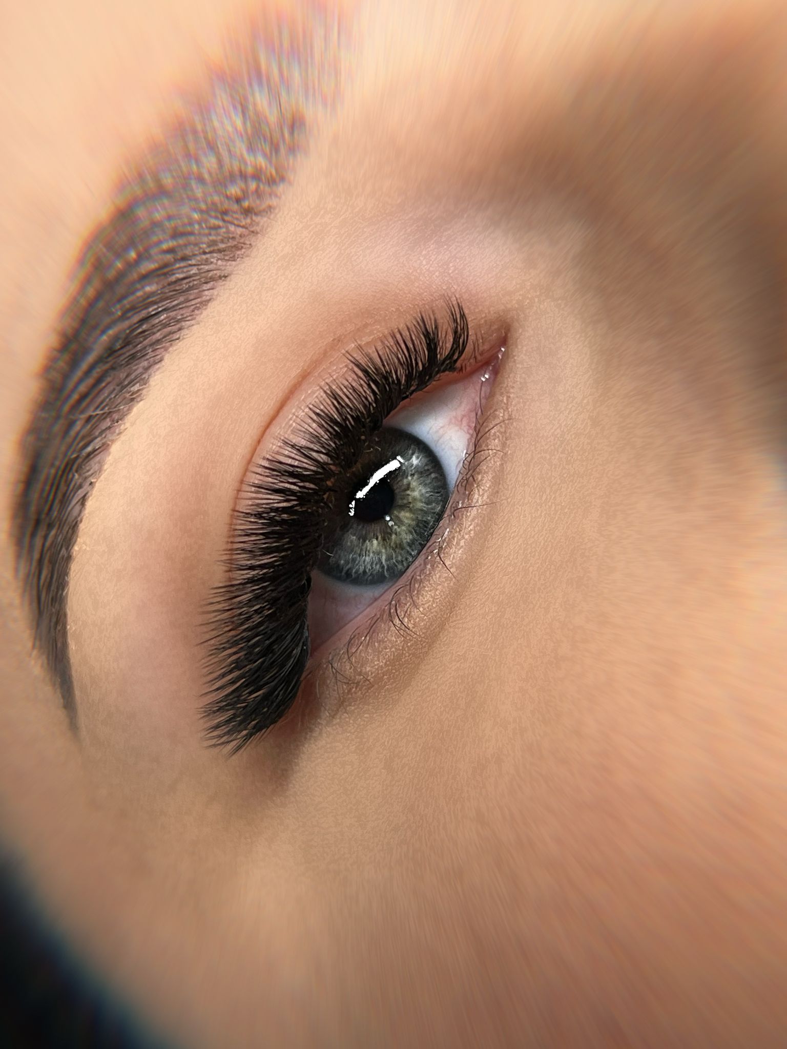 - 3D (Glam Volume) – Se aplică trei extensii fine pe fiecare geană naturală, creând un efect mai plin și mai intens, fără a părea încărcat.